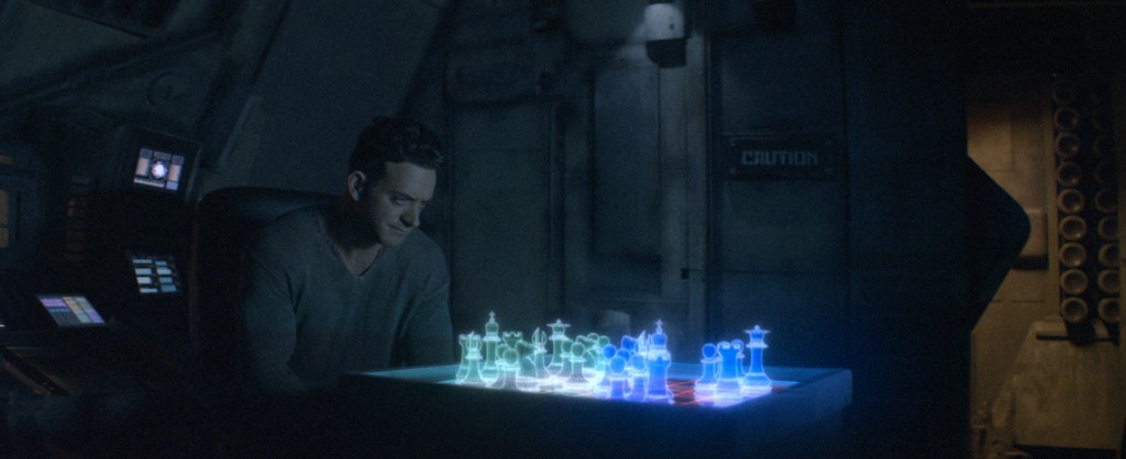 ELI SASICH – Our production designer, Alec Contestabile, designed and built the hologram board in Cole’s ship, the cryosleep pods, and the table in the mess hall, matching the look and feel of what already existed at Laurel Canyon. The hologram board was a wooden box with a glossy tabletop, and practical LED lights hidden in the inner lip. The LEDs helped sell the effect of the chessboard by providing interactive lighting on Cole’s face.