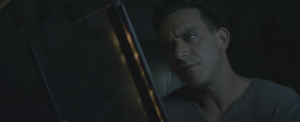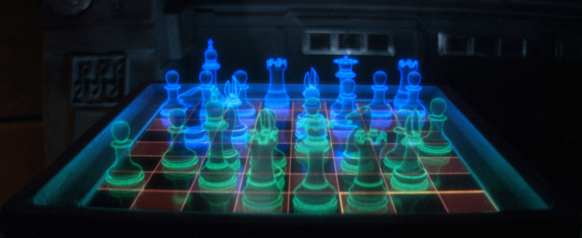 The chessboard hologram was an incredible effect. We had a set piece with built-in practical lighting, but the LEDs were visible in many shots, and quite distracting. Ryan ended up replacing the top of the chessboard in every shot, so the lights were covered. He then built the hologram projection in Adobe After Effects, utilising Element 3D for the chess pieces, together with layer upon layer of compositing tricks. The opening shot, where we pull out of the holographic chess piece, was a completely digital camera move up until the tilt-up to Cole.