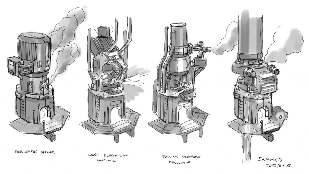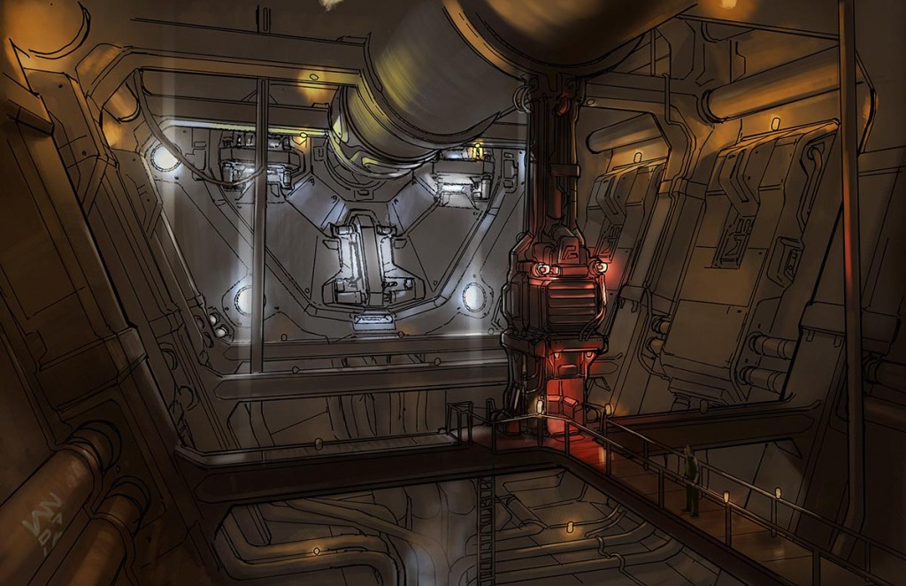 RYAN WIEBER — I had a concept artist, Ian Galvin, explore the general shape of the space — we wanted it to be warm and steamy, kind of like an engine room, somewhere that wouldn’t be comfortable. It was important to me to have some big structural components, and this big drive shaft coming in overhead. We had some recurring elements to sell the scale, like catwalks and little cage lights. We turned that over to Tobias, and he kitbashed and embellished it.