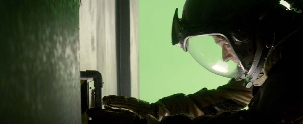 ELI SASICH – It was a difficult shot for several reasons. First and foremost, we didn’t have the space to dolly back from the cockpit set, let alone make the turn around the side. So we shot the plate of Cole in the cockpit as a wide lock-off. Tobias and his team then projected that live action footage onto a 2D card within a low-poly CG cockpit set which they had modelled.