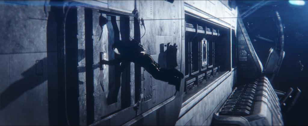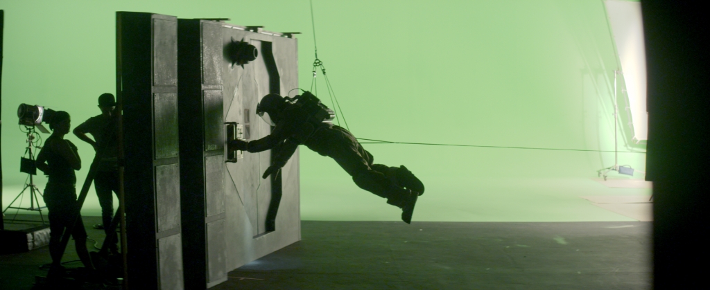 ELI SASICH — I wanted to get as much of our actor in there as possible, so we built a little airlock door and shot a couple of days with Tony on wires in front of a greenscreen. The rest was CG with a digi-double.
