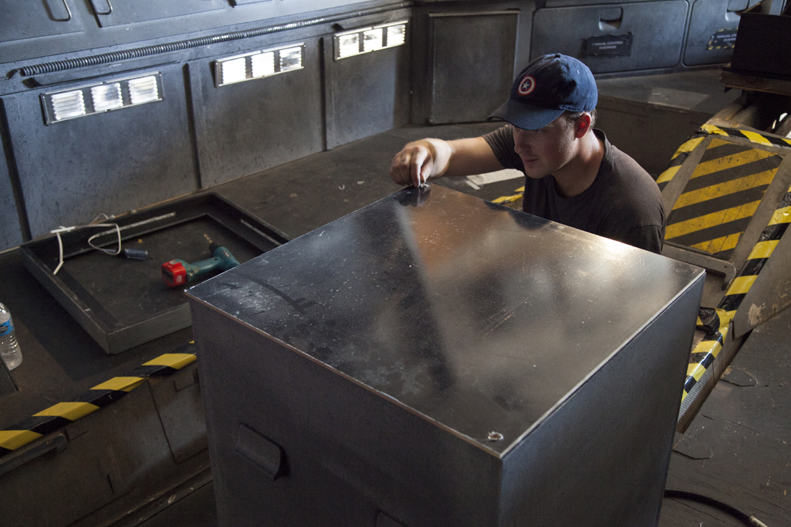 The cryosleep pods were made out of foam-core board, cardboard, and various pieces of junk – tubes and wiring – all attached to a wooden frame. They only weighed about 15 pounds, so one crewmember could move them. The table in the mess hall was fashioned by bolting two plastic pallets together and covering them with scrap pieces of Plexiglass.