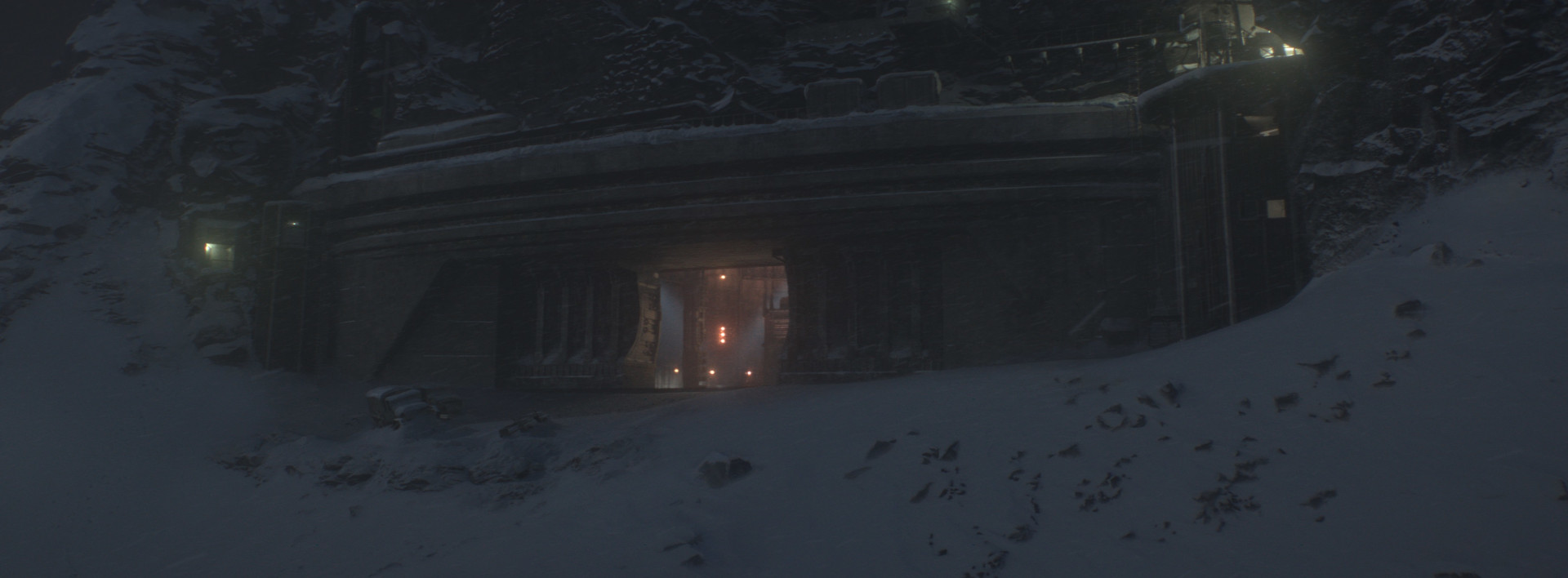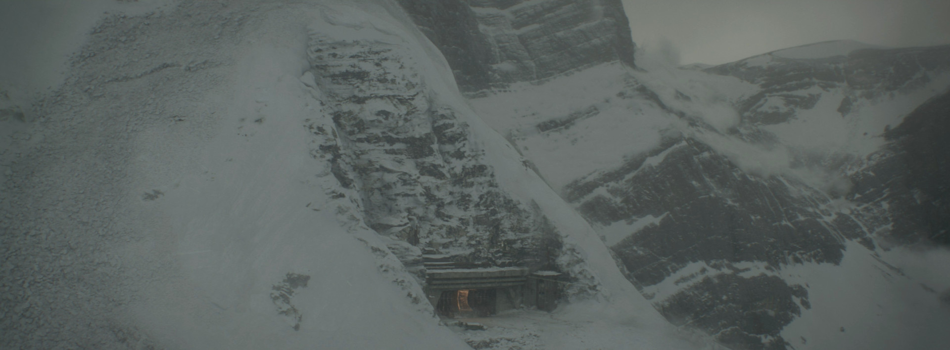 Early on, in-house visual effects art director Thomas Wingrove developed a design for the bunker entrance was based on the Svalbard Global Seed Vault on the Norwegian island of Spitsbergen. This later evolved into a massive concrete structure with a steel gate embedded into a mountainside, which RISE built for bunker establishers throughout the film.