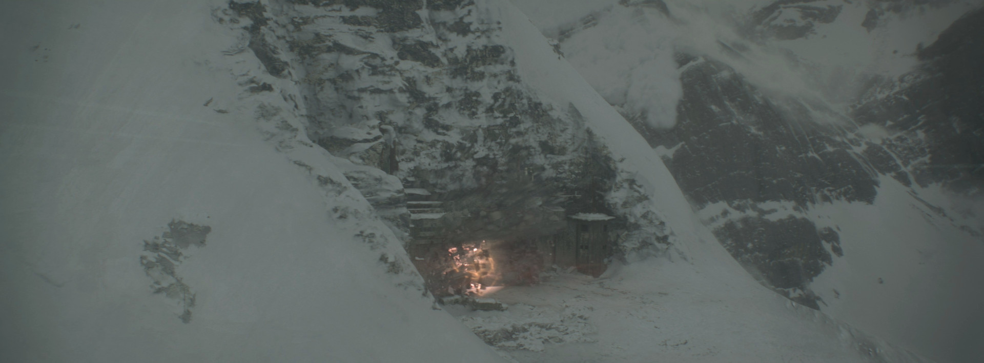 Exteriors combined aerial plates projected onto proxy geometry with full-CG mountains and digital matte painting backdrops. “In the libraries that the plates were taken from,” said RISE visual effects supervisor Florian Gellinger, “there was also helicopter footage with snow falling. It looked very odd — I’d never seen anything like it before. You’ve got the helicopter motion and the wind, and the snowflakes themselves are so tiny. The way they behave in front of the camera lens looks surreal. We built a particle simulation that did just that.”