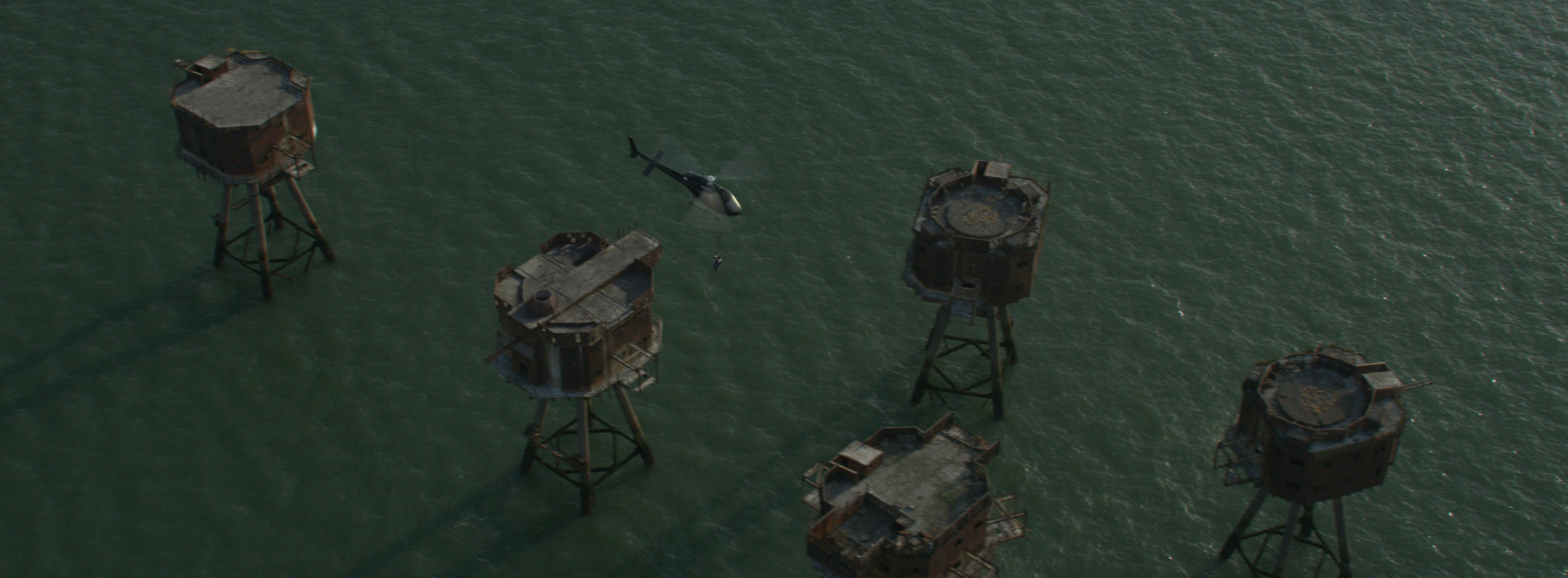 For establishing shots of the sea fortress where Mulch is being held, Marzano Films captured aerial plates of the Maunsell Fort at Red Sands in the mouth of the Thames Estuary, just off the coast of southeast England. Built in 1942 and now abandoned, this group of seven stilted platforms was part of a defense network designed to protect the city of London during World War II.